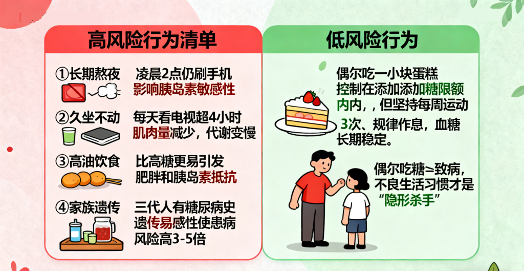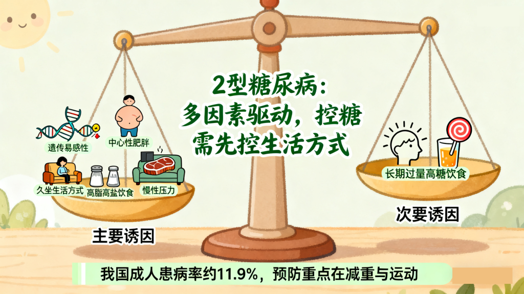 很多人关注 “吃糖多少”,却忽略了比吃糖更危险的 “隐形风险因素”,这些因素才是 2 型糖尿病的主要 “推手”: