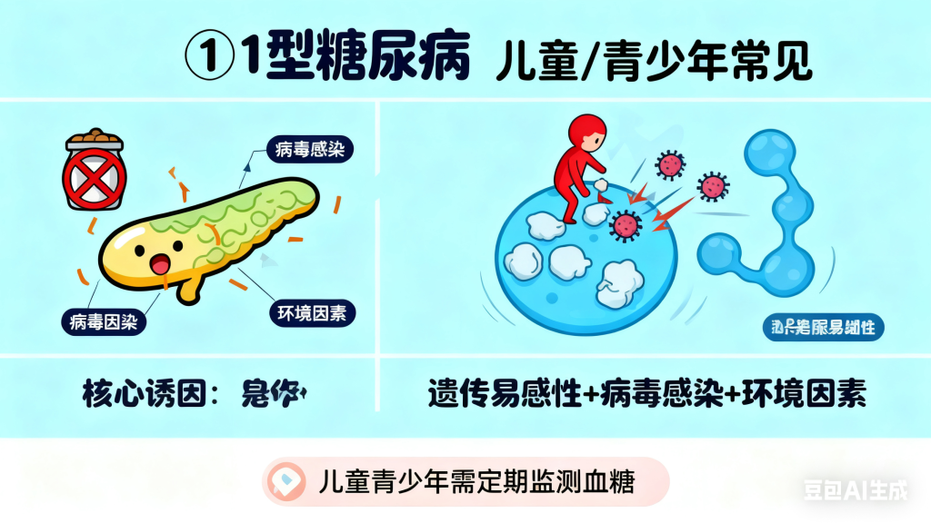 这类糖尿病的发病与 “吃糖多少” 毫无直接关联,主要诱因包括遗传易感性(如家族中有 1 型糖尿病患者)、病毒感染(如柯萨奇病毒、风疹病毒感染可能触发免疫反应)、环境因素(如婴儿期过早接触牛奶蛋白)。例如,有些孩子从未吃过甜食,却因病毒感染后免疫紊乱,突然出现多饮、多尿、体重骤降等 1 型糖尿病症状,需终身依赖胰岛素治疗。
