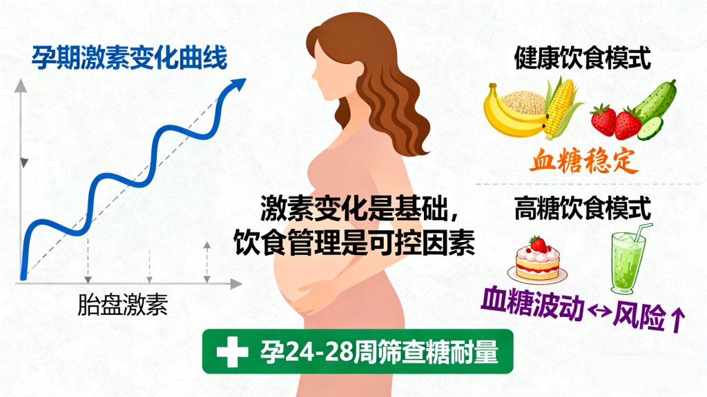 妊娠期糖尿病是孕期特有的糖尿病类型,多发生在孕 24-28 周。其核心诱因是孕期激素变化—— 胎盘分泌的孕激素、雌激素会拮抗胰岛素,导致胰岛素敏感性下降。