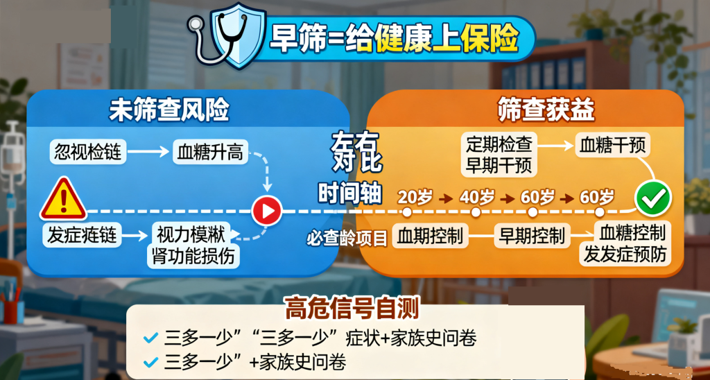 场景二:50 岁的张阿姨很少吃甜食,却因家族中有 3 位糖尿病患者,加上退休后每天久坐看电视超 6 小时、体重逐年增加,去年体检被诊断为 “2 型糖尿病前期”,空腹血糖达到 6.8mmol/L。