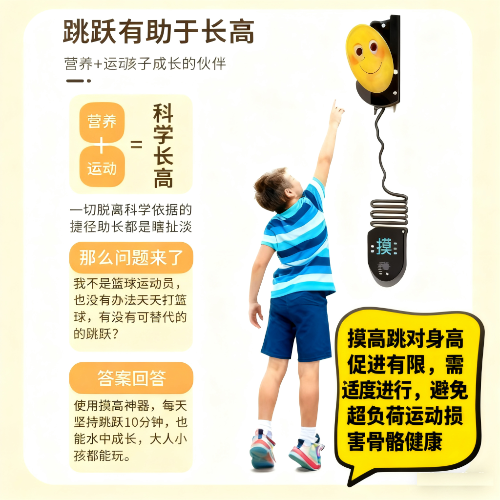 但需要明确的是,摸高跳并非孩子长高的 “关键密码”。孩子身高主要受遗传因素影响,占比约 70%,后天的营养、睡眠、运动、情绪等因素仅占 30% 左右。而且,摸高跳对身高的促进作用是有限的,必须建立在 “适度” 的基础上。如果盲目追求效果,让孩子进行超负荷的摸高跳,反而会适得其反,给孩子的骨骼健康埋下隐患。