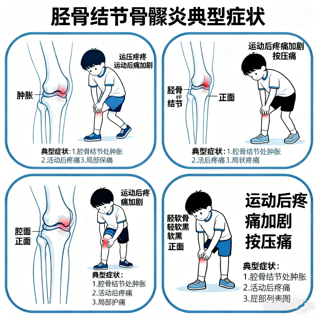如果孩子在进行摸高跳等跳跃运动后,出现以下症状,家长需警惕可能是患上了胫骨结节骨骺炎: