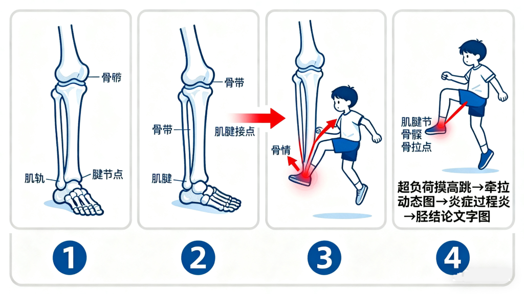 胫骨结节骨骺炎是儿童和青少年常见的运动损伤性疾病,多发于 10-15 岁处于生长发育期的孩子,尤其在喜欢跑跳、球类运动的青少年中较为常见。之所以超负荷摸高跳容易引发这种疾病,与孩子特殊的生理结构和运动特点密切相关。