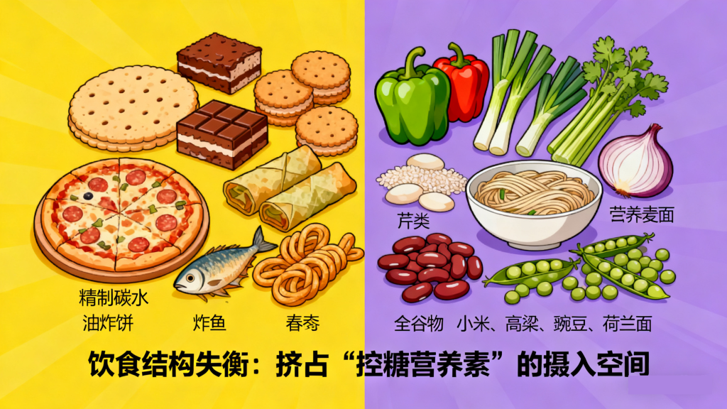 若日常饮食中肉类占比过高,往往会导致蔬菜、全谷物、豆类等富含膳食纤维、维生素和矿物质的食物摄入不足,而这些营养素正是 “控糖关键”: