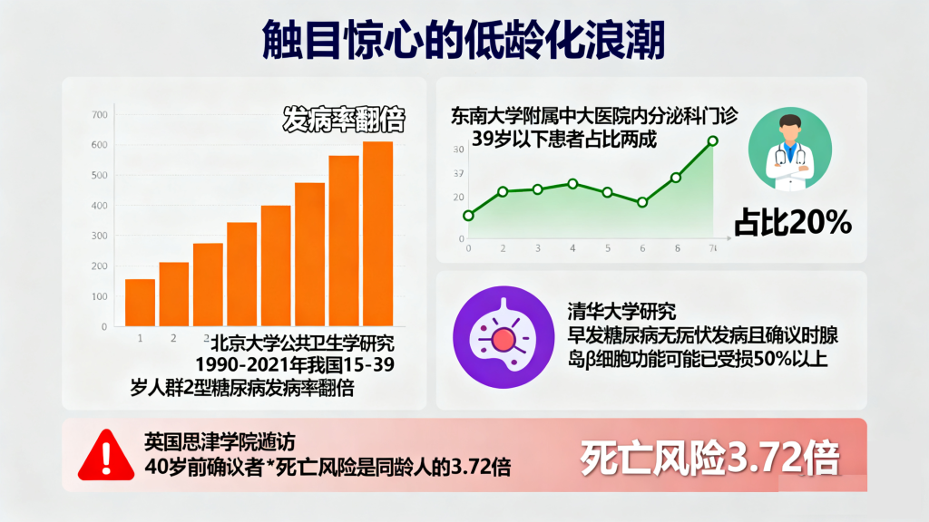 查看全文糖尿病已不再是中老年专属的 “代谢杀手”。北京大学公共卫生学院研究显示,1990 至 2021 年我国 15~39 岁人群 2 型糖尿病发病率翻了一倍,远超全球平均水平。临床数据更直观:东南大学附属中大医院内分泌科门诊中,39 岁以下患者占比已达两成。