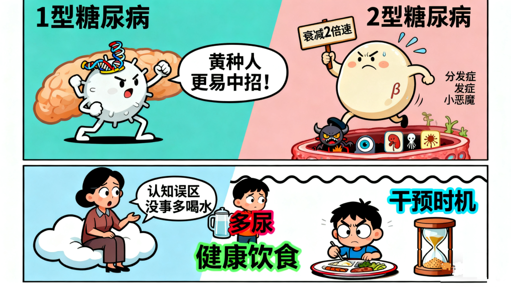 1 型糖尿病好发于儿童青少年,与遗传、自身免疫及环境因素相关,黄种人爆发性 1 型糖尿病发病率显著高于白种人。而青少年 2 型糖尿病患者的胰岛 β 细胞功能衰减速度是成人的 2 倍,更早出现视网膜病变、肾病等并发症。