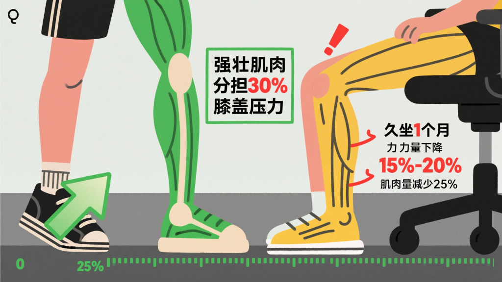 这也是为什么很多人久坐后起身走路,会感觉膝盖 “发软、发晃”—— 本质是肌肉无力导致的保护不足。