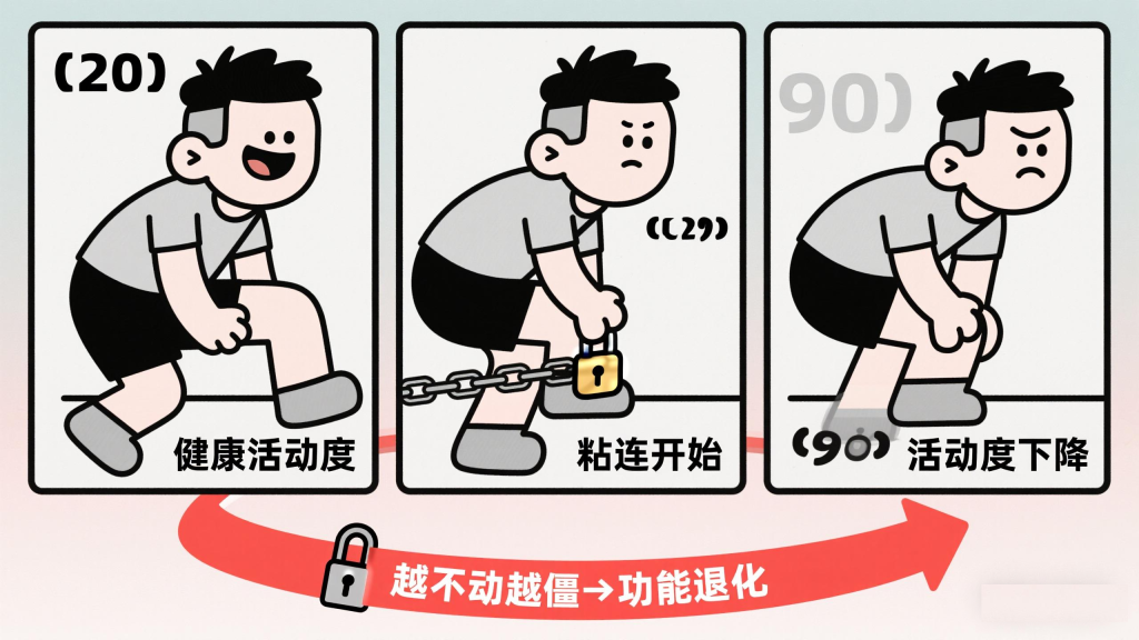 长期不运动,膝关节的韧带、滑膜会逐渐粘连,活动范围慢慢缩小:原本能轻松蹲下的人,可能半年后蹲到一半就膝盖发紧;上下楼梯时膝盖 “卡顿”,甚至伴随弹响声。这种 “活动度下降” 会形成恶性循环:越不动越僵,越僵越不敢动,最终导致膝盖功能退化,稍微走点路就疼痛。