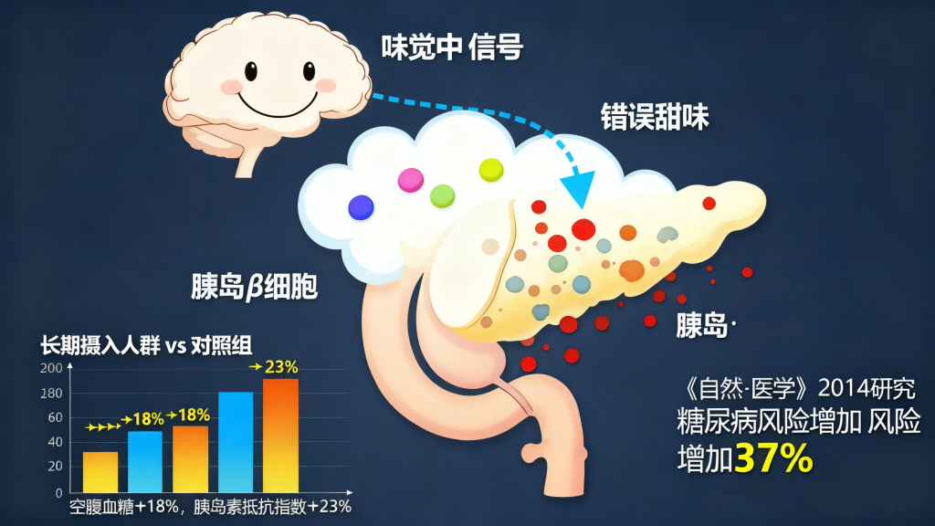 其次,人工甜味剂可能影响胰岛素的正常分泌。虽然人工甜味剂本身不直接升高血糖,但它们通过味觉受体刺激大脑,传递“甜味信号”,这种信号可能会误导身体分泌胰岛素。长期反复的“信号误判”会导致胰岛素分泌节律紊乱,降低胰岛素的生物活性,最终增加糖尿病的发病风险。2014年发表在《自然·医学》杂志上的一项研究就指出,长期摄入人工甜味剂的人群,其空腹血糖水平和胰岛素抵抗指数均显著高于未摄入人群,患糖尿病的风险增加了37%。