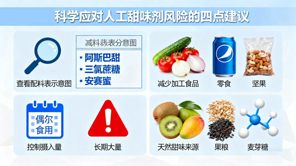 面对人工甜味剂的潜在风险,并非意味着要完全杜绝所有含添加剂的食品,而是要学会科学识别、合理控制摄入量。以下是几点实用建议: