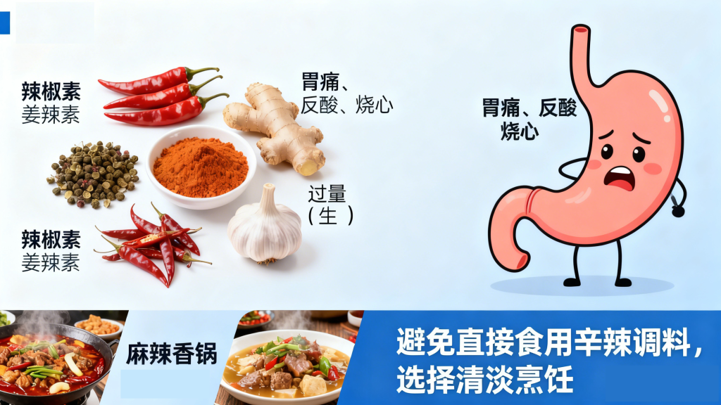 辣椒、花椒、生姜(过量)、大蒜(生)等辛辣食物中含有的辣椒素、姜辣素等成分,会直接刺激胃黏膜,导致胃黏膜充血、水肿,甚至引发糜烂。对于本身有胃炎、胃溃疡的人来说,这类食物会加剧胃痛、反酸、烧心等症状。比如过量食用火锅、麻辣香锅后,很多人会出现胃部灼烧感,就是胃黏膜受刺激的典型表现。建议胃不好的人尽量选择清淡烹饪方式,避免直接食用辛辣调料。