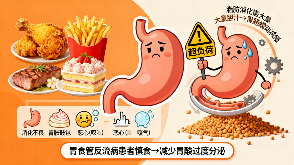 炸鸡、薯条、肥肉、奶油蛋糕等油腻食物中脂肪含量极高,而胃部消化脂肪需要分泌大量胆汁和消化酶,且消化过程缓慢。长期或过量食用这类食物,会使胃部持续处于“高强度工作”状态,导致胃肠蠕动减慢,引发消化不良、恶心、嗳气等症状。此外,油腻食物还可能刺激胃酸过度分泌,加重胃食管反流,对于胃食管反流病患者尤为不友好。