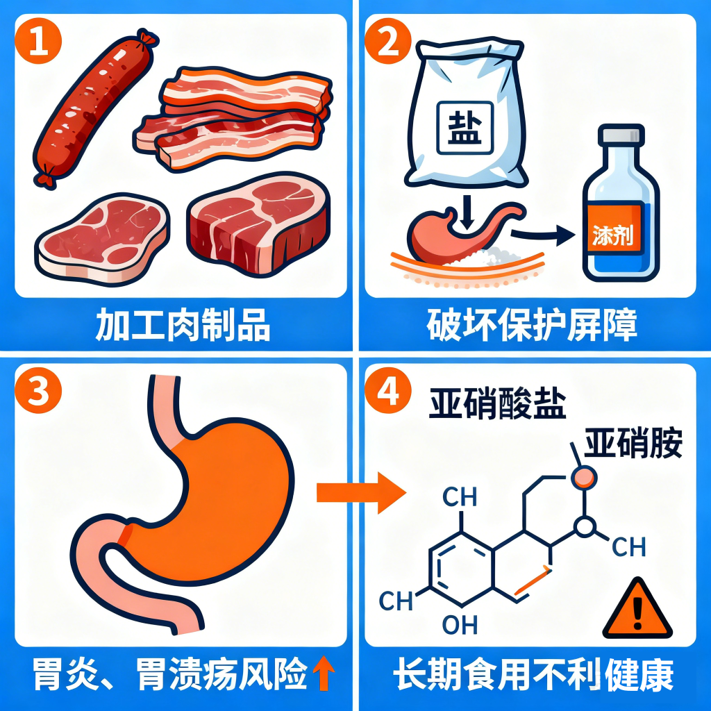 香肠、培根、火腿、腊肉等加工肉制品,为了延长保质期和提升风味,通常含有较高的盐分和亚硝酸盐等食品添加剂。高盐会刺激胃黏膜,破坏胃黏膜的保护屏障,增加胃炎、胃溃疡的发病风险;亚硝酸盐在胃内可能转化为致癌物质亚硝胺,长期食用对胃部健康极为不利。此外,这类食物质地较硬,消化难度大,容易加重胃部负担。