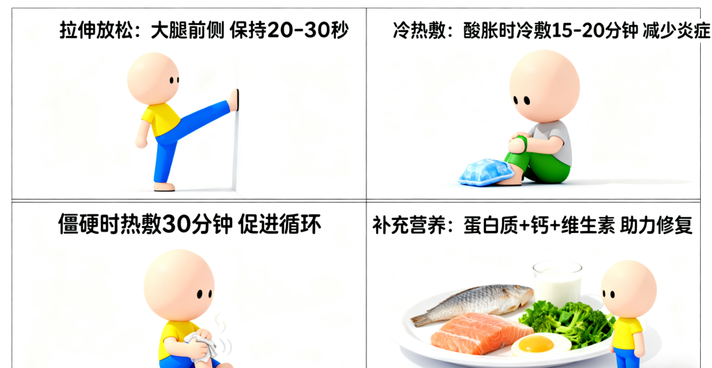 拉伸放松:跑步后进行静态拉伸,重点拉伸大腿前侧、后侧、外侧以及小腿肌肉,每个动作保持20-30秒,帮助肌肉恢复弹性。