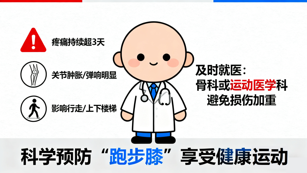 如果跑步后出现膝关节疼痛持续超过3天、疼痛加剧影响行走或上下楼梯、关节肿胀、弹响明显等情况,不要自行贴膏药或硬扛,应及时到骨科或运动医学科就诊,通过体格检查或超声检查明确诊断,接受物理治疗或药物治疗,避免损伤进一步加重。
