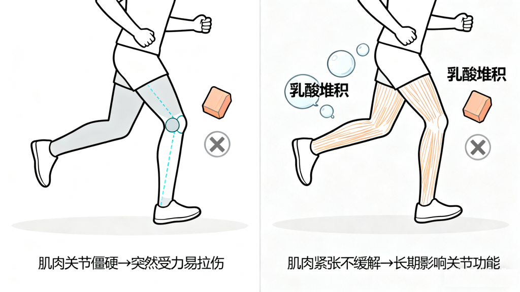 忽视热身与恢复:跑步前不热身,肌肉和关节处于僵硬状态,突然受力易发生拉伤;跑步后不拉伸、不放松,乳酸堆积和肌肉紧张无法缓解,长期会影响关节功能。