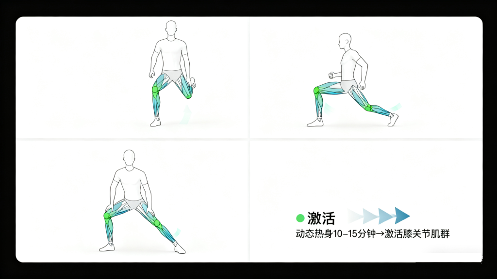 跑步前的热身绝非“走过场”,而是让膝关节“提前进入状态”的关键。建议采用“动态热身”方式,避免静态拉伸,时间控制在10-15分钟,重点激活膝关节周围肌群: