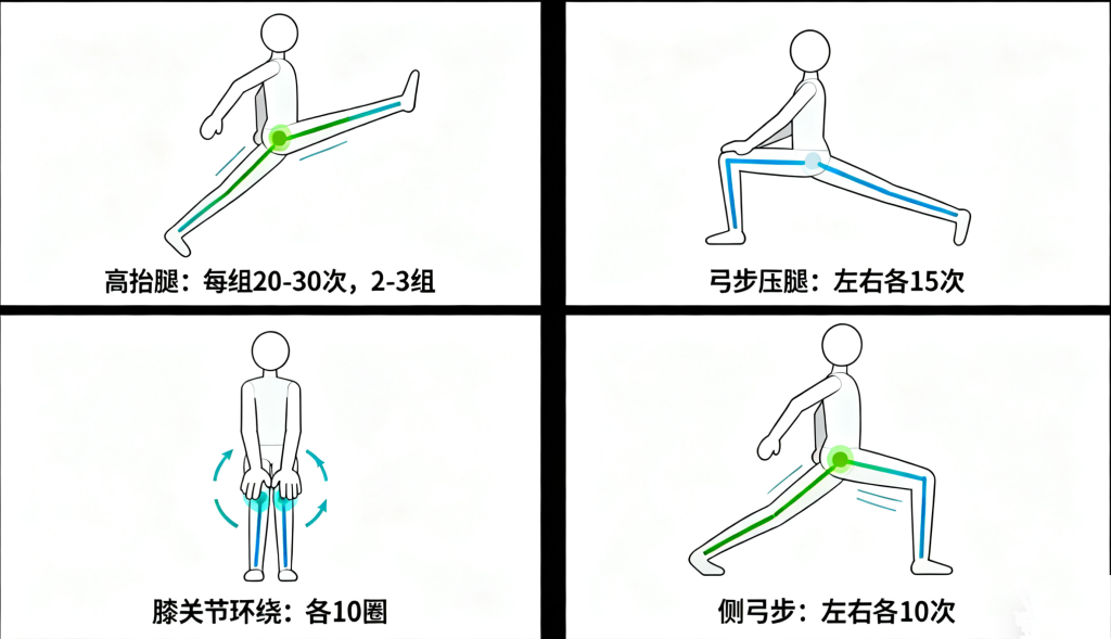 侧弓步:左右侧各10次,激活内收肌和臀部外侧肌肉,提升关节稳定性。