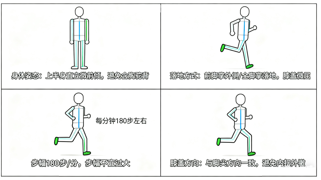 步幅与步频:优先保证步频(每分钟180步左右为宜),步幅不宜过大,避免膝盖伸直时落地,减少关节瞬间受力。
