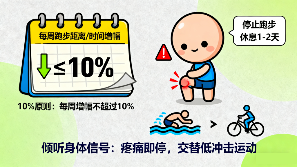 膝关节的适应能力需要逐步培养,突然增加运动量是“跑步膝”的主要诱因之一。遵循“10%原则”是关键:即每周跑步的距离、时间或频率增幅不超过10%,给关节和肌肉足够的适应时间。