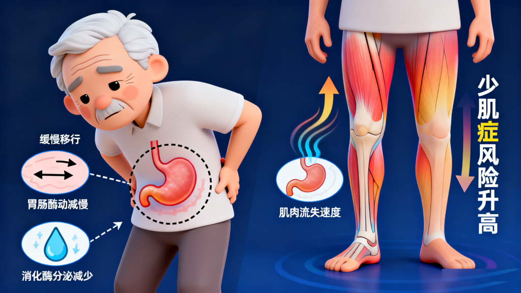 生理机能衰退:随着年龄增长,老人消化吸收功能自然下降,胃肠蠕动减慢、消化酶分泌减少,导致蛋白质的消化吸收率降低;同时,老年人体内肌肉流失速度加快(即“少肌症”风险升高),对蛋白质的需求本就比年轻人更高,供需失衡易引发不足。