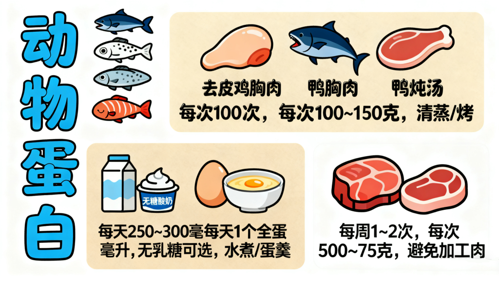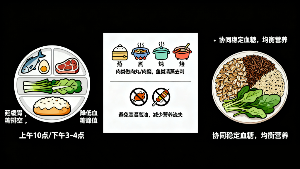 • 蛋类:鸡蛋是性价比极高的优质蛋白来源,蛋黄虽含胆固醇,但糖尿病老人每天吃1个全蛋通常是安全的(若合并高胆固醇血症,可咨询医生后隔天吃1个蛋黄),可做成水煮蛋、蛋羹等易消化形式。