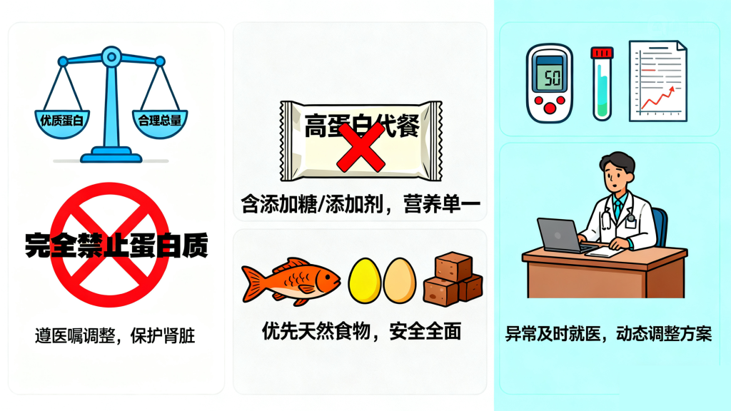• 避免过度限制:部分合并肾病的老人因担心“蛋白质伤肾”而过度忌口,导致蛋白质严重不足,反而加速肌肉流失和免疫力下降。实际上,合理控制蛋白质总量(而非完全禁止),并优先选择优质蛋白,才是保护肾脏的正确方式,需严格遵医嘱调整。