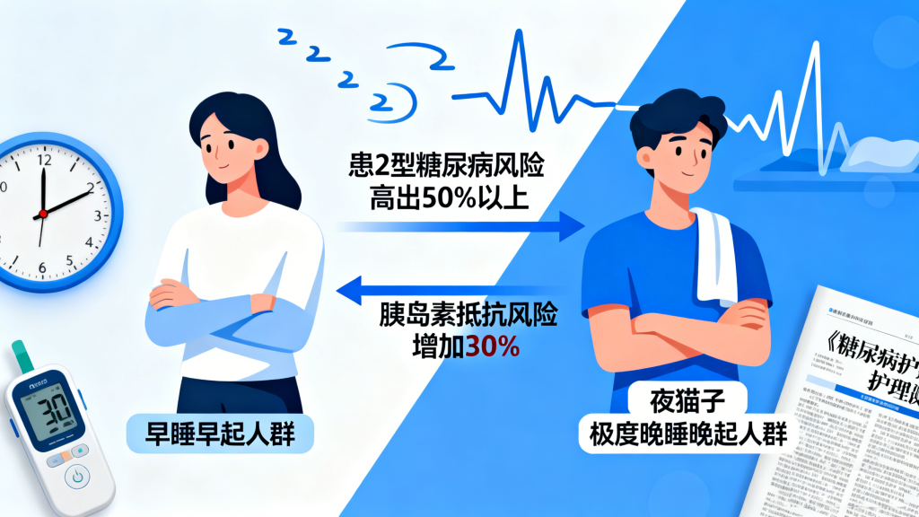 多项流行病学研究已证实“夜猫子”与糖尿病风险的相关性。例如,一项针对上万名成年人的长期追踪研究发现,将自身作息定义为“极度晚睡晚起”的人群,患2型糖尿病的风险比“早睡早起”人群高出50%以上。另一项发表在《糖尿病护理》期刊上的研究则通过监测受试者的睡眠节律和代谢指标发现,即使排除了体重、饮食等因素,晚睡模式本身仍会使胰岛素抵抗风险增加30%,而胰岛素抵抗正是2型糖尿病的核心病理基础。