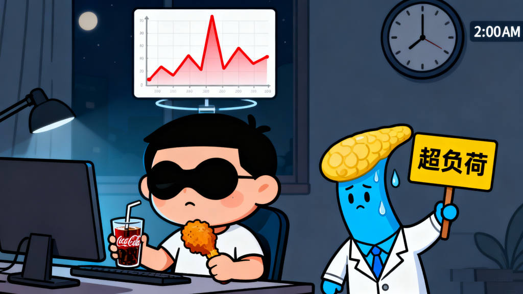 晚睡的作息往往会衍生出一系列不健康的生活习惯。深夜时分,“夜猫子”更易摄入高糖饮料、油炸食品等夜宵,这些食物会在短时间内导致血糖骤升,加重胰腺负担。同时,熬夜时人体活动量极少,热量消耗降低,多余的能量会转化为脂肪堆积在体内,尤其是腹部脂肪,会进一步加剧胰岛素抵抗。此外,长期熬夜还可能导致运动量不足——“夜猫子”白天往往精神萎靡,缺乏运动意愿,而运动本身能改善胰岛素敏感性,缺乏运动则会让代谢问题雪上加霜。