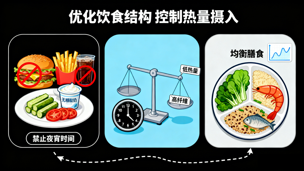 坚决杜绝深夜吃夜宵的习惯,尤其是高糖、高脂、高盐的食物。如果夜间确实感到饥饿,可以选择少量低热量、高纤维的食物,如黄瓜、番茄、无糖酸奶等。白天要注意饮食均衡,增加蔬菜、全谷物、优质蛋白质(如鱼、虾、瘦肉、豆制品)的摄入,减少精制米面、含糖饮料的摄入。定时定量进餐,避免暴饮暴食,有助于维持血糖稳定。