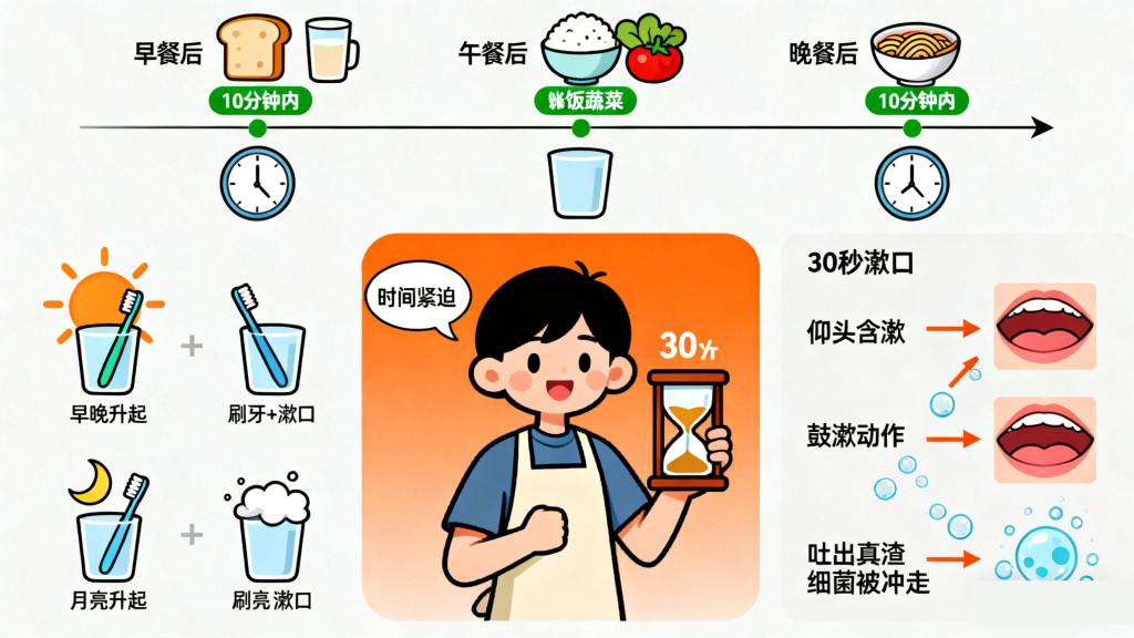 2. 漱口的时机与频率:饭后必漱,早晚辅助
