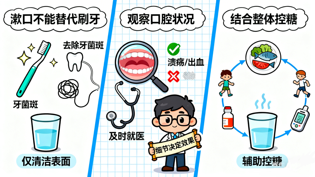 想要让漱口真正发挥辅助控糖的作用,关键在于掌握正确的方法,避免陷入误区。以下是专为糖尿病患者整理的漱口要点: