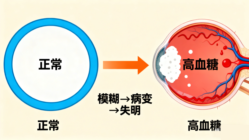 眼睛是精密的“光学仪器”,视网膜上的微小血管和视神经对血糖变化极为敏感。当血糖长期偏高时,视网膜血管会发生病变,血管壁增厚、变脆,甚至出现渗漏、出血,导致视网膜水肿、缺氧,进而影响视觉信号的传导。初期可能表现为视物模糊、重影,尤其在血糖波动较大时明显,很多人会误以为是“老花眼”或“用眼过度”;若长期忽视,可能发展为糖尿病视网膜病变,严重时会导致失明。此外,高血糖还可能引发白内障,使晶状体混浊,让视力逐渐下降。