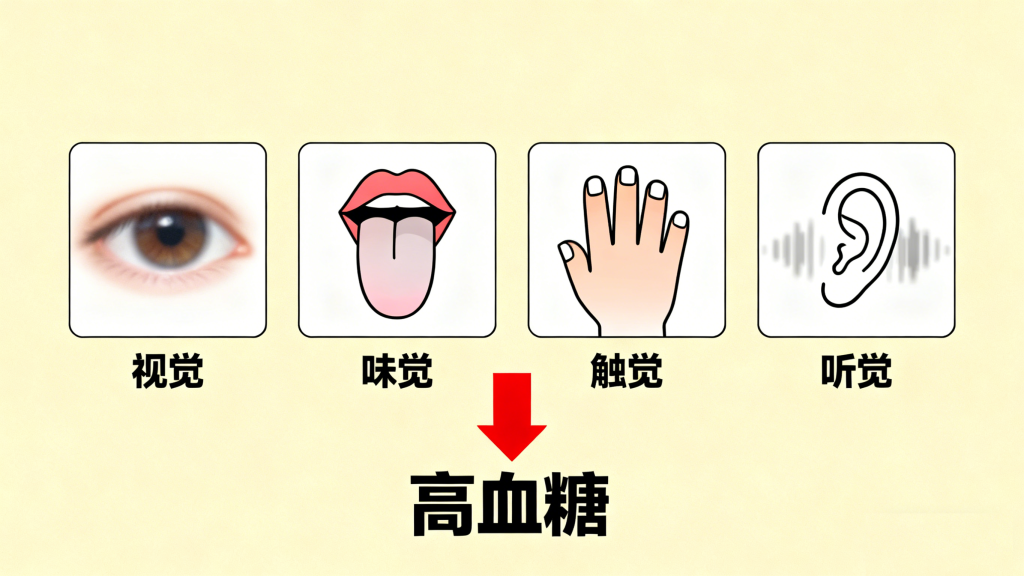 人体的视觉、味觉、触觉、听觉等感官功能,依赖于神经组织的精准传导和感官器官的正常代谢,而高血糖会通过“糖毒性”损伤神经和血管,给感官系统带来多方面打击。