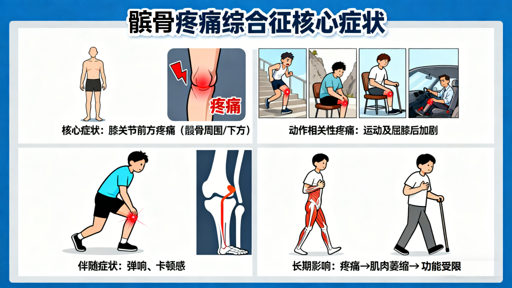该疾病的核心症状是膝关节前方疼痛,通常位于髌骨周围或髌骨下方,疼痛性质多为隐痛、酸痛或刺痛,具有明显的“动作相关性”,具体表现为: