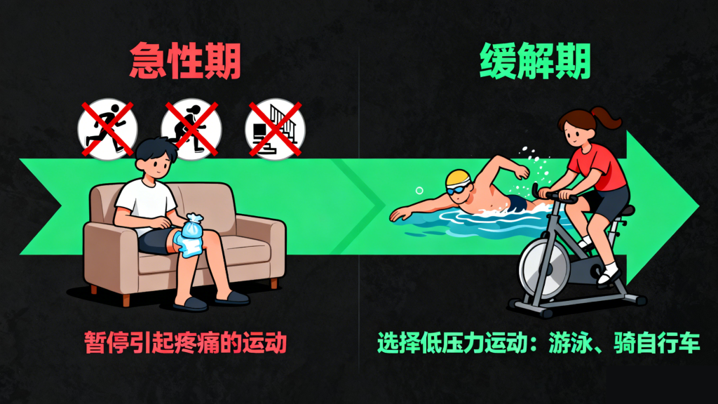 急性期(疼痛明显时)应减少或暂停引起疼痛的运动,避免深蹲、爬楼梯、长时间屈膝等动作,让髌股关节得到充分休息。待疼痛缓解后,可选择对膝关节压力小的运动,如游泳、骑自行车,替代跑步等高强度运动。