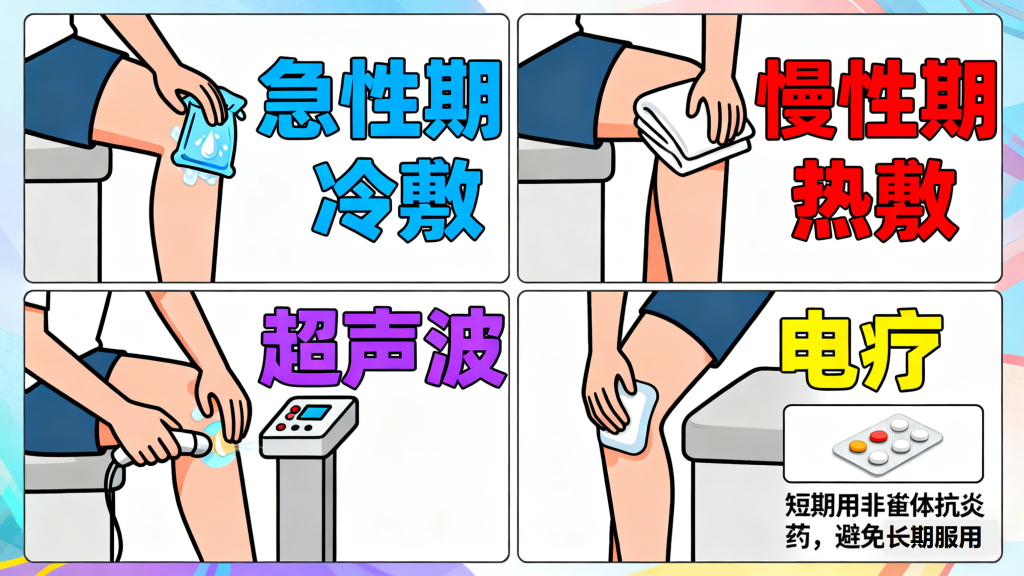 疼痛明显时,可在医生指导下使用冷敷(急性期)或热敷(慢性期)缓解症状;也可通过超声波、电疗等物理治疗手段,促进局部血液循环,减轻炎症。若疼痛较严重,可短期使用非甾体类抗炎药(如布洛芬),但需避免长期服用。
