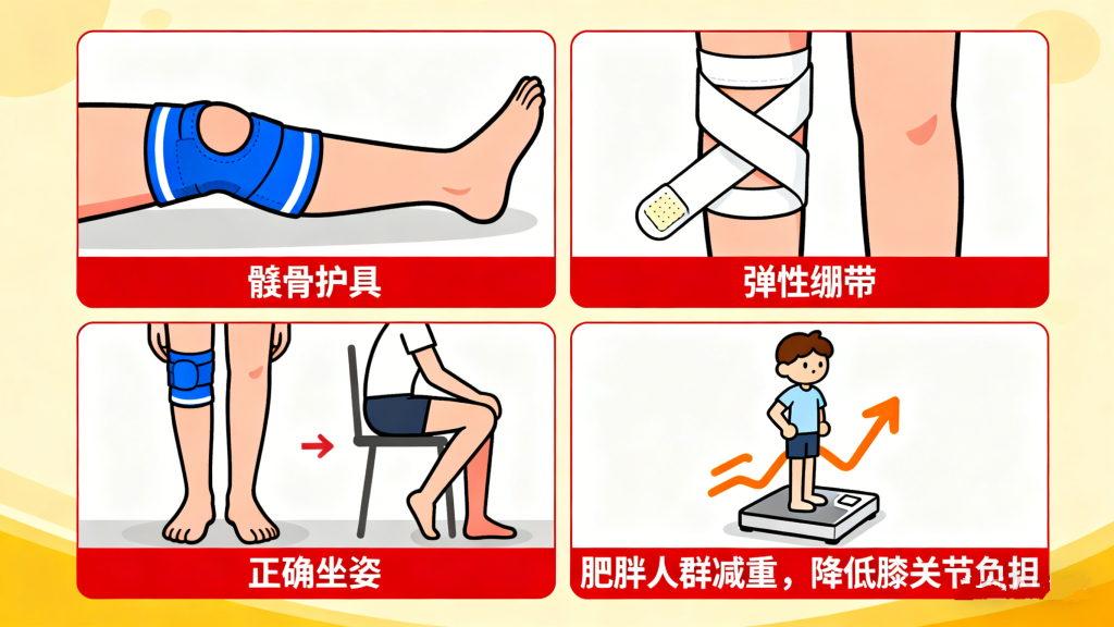 可在医生指导下使用髌骨护具、弹性绷带等,帮助维持髌骨位置,减轻运动时的压力;日常注意保持正确坐姿,避免跷二郎腿,选择舒适的平底鞋,肥胖人群应积极减重,降低膝关节负担。