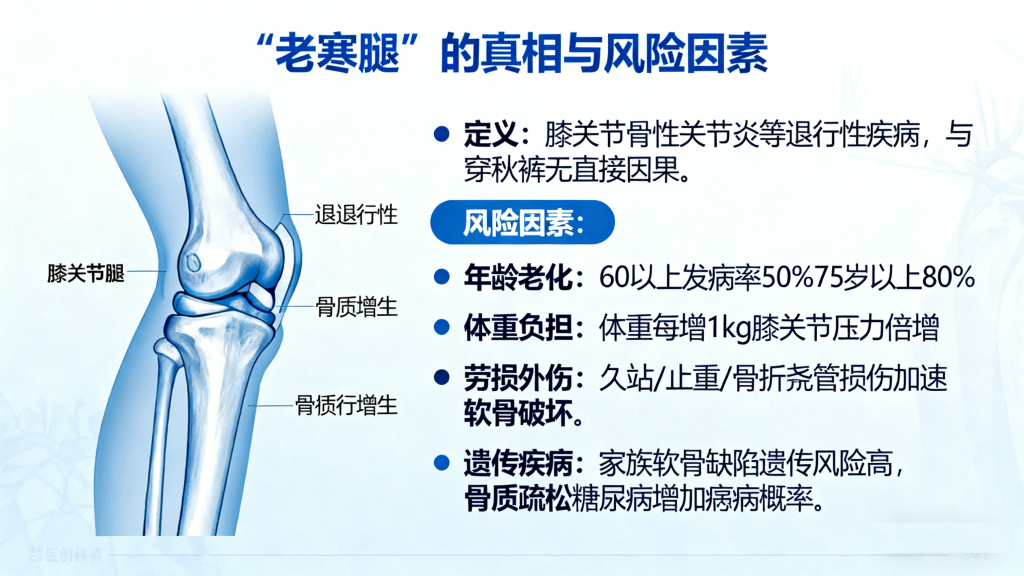 在医学领域,民间常说的“老寒腿”并没有绝对统一的定义,但其核心所指的是膝关节骨性关节炎这一退行性疾病,有时也涵盖类风湿性关节炎、下肢血管疾病等引发的腿部不适。而这些疾病的发病原因,与“穿不穿秋裤”几乎没有直接因果关系。膝骨关节炎的主要特征是膝关节软骨退行性病变和继发性骨质增生,其发病与多种因素相关,但寒冷并非主因。综合权威医学解读,“老寒腿”的真正风险因素集中在以下几方面: