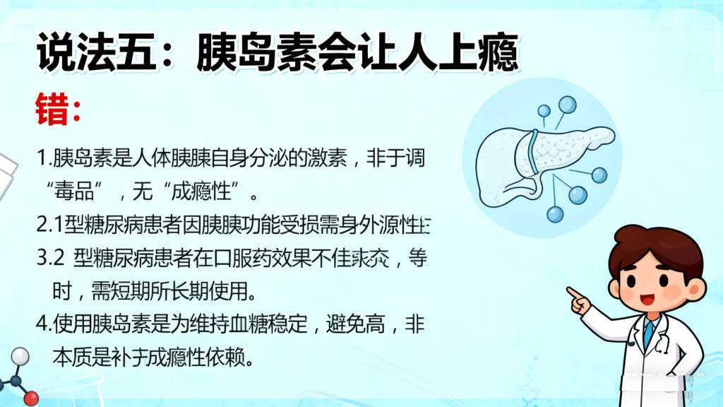 结论:错。胰岛素是人体胰腺自身分泌的激素,用于调节血糖,并非“毒品”,不存在“成瘾性”。1型糖尿病患者因胰腺功能受损无法分泌胰岛素,需终身外源性补充;2型糖尿病患者在病程中,若口服药效果不佳或出现急性并发症,也需短期或长期使用胰岛素控制病情。