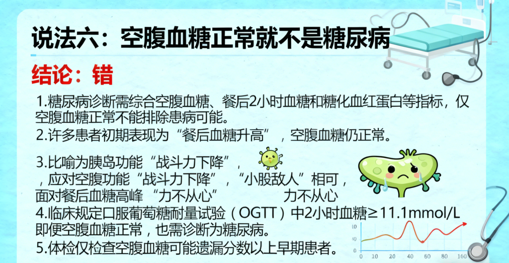 结论:错。糖尿病的诊断需综合空腹血糖、餐后2小时血糖和糖化血红蛋白等指标,仅空腹血糖正常不能排除患病可能。许多患者初期表现为“餐后血糖升高”,而空腹血糖仍在正常范围。