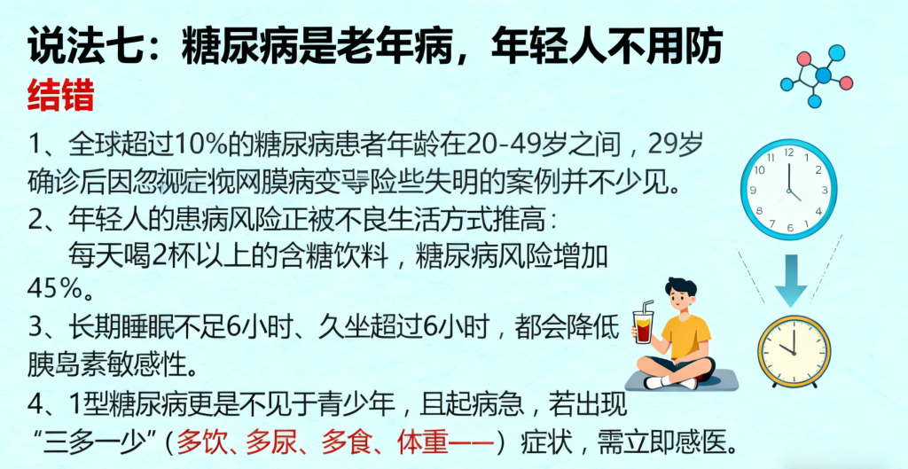 年轻人的患病风险正被不良生活方式推高:每天喝2杯以上含糖饮料,糖尿病风险增加41%;长期睡眠不足6小时、久坐超过6小时,都会降低胰岛素敏感性。1型糖尿病更是多见于青少年,且起病急,若出现“三多一少”(多饮、多尿、多食、体重减轻)症状,需立即就医。