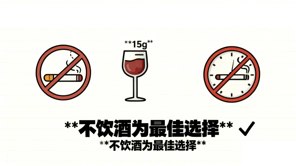 改善建议:最根本的保护方式是戒烟限酒。若无法立即戒烟,应避免在饭后吸烟(此时胃黏膜血流丰富,尼古丁吸收更快,伤害更大);饮酒时选择低度酒,避免空腹饮酒,成年人每日酒精摄入量应控制在15克以内(约相当于1两低度白酒或半瓶啤酒),最好做到不饮酒。