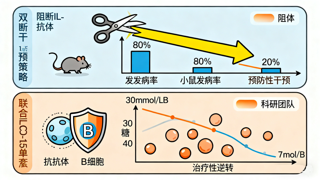 基于这一发现,团队提出靶向“单核细胞/巨噬细胞—IL-15—CD226⁺ B细胞轴”的干预策略:在动物模型中,阻断IL-15信号通路可显著降低发病率;对已发病小鼠,联合使用两种单抗能协同逆转高血糖。这种从“被动补胰岛素”到“主动保胰岛”的转变,为早期患者保留残余胰岛功能提供了新方案。深圳恒生医院安赤颖团队则通过“免疫调节+代谢干预+肠道菌群重建”的整合方案,已让11名早期患者成功停用胰岛素。