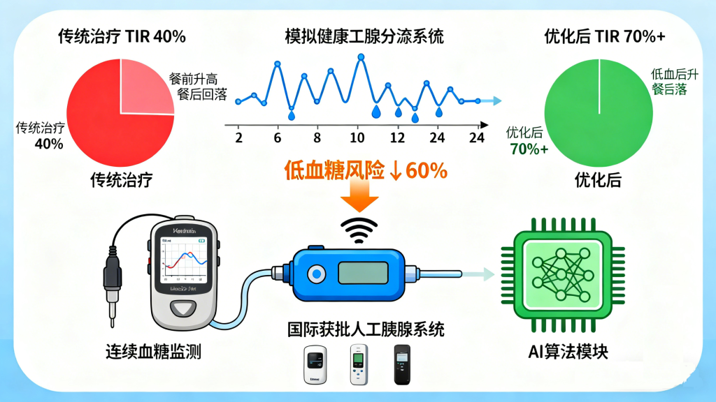 对于暂时无法接受细胞治疗的患者,智能人工胰腺系统正在优化治疗体验。这种系统整合了连续血糖监测仪、胰岛素泵与AI算法,能实时感知血糖变化并自动调节胰岛素输注剂量,模拟健康胰腺的分泌节律。目前,国际上已有多款人工胰腺获批上市,可将患者血糖达标时间(TIR)从40%左右提升至70%以上,显著减少低血糖风险。