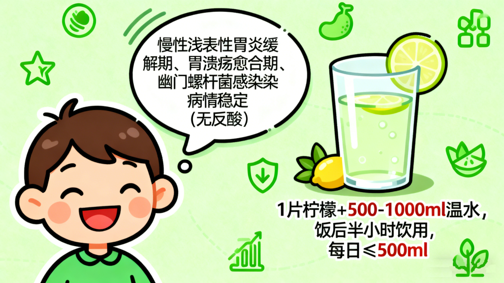 对于病情稳定的慢性胃病患者,比如慢性浅表性胃炎缓解期、胃溃疡愈合期,且平时没有明显反酸、烧心症状的人群,并非绝对不能喝柠檬水,关键在于“温和饮用”。此时患者的胃黏膜损伤较轻,或已基本愈合,对温和酸性物质的耐受度较高。适量饮用稀释后的柠檬水,其中的柠檬酸浓度较低,并不会对胃黏膜造成强烈刺激;甚至有研究表明,柠檬中含有的类黄酮等物质,还具有一定的抗氧化、保护黏膜的潜在作用(需注意:这并非治疗功效,不能替代药物)。此外,对于伴有幽门螺杆菌感染、病情稳定的患者,只要没有反酸等不适,也可少量饮用。