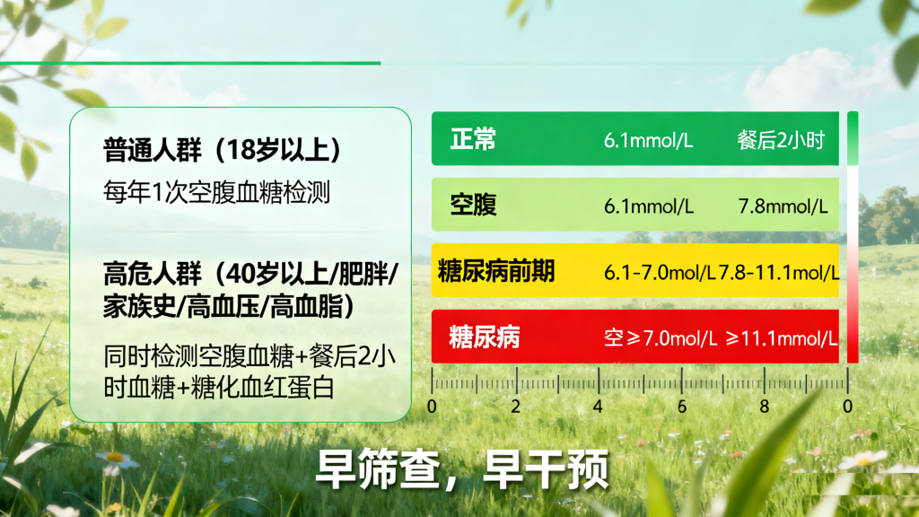 建议18岁以上成年人,每年至少进行一次空腹血糖检测;40岁以上、肥胖、有糖尿病家族史、高血压/高血脂患者等高危人群,需同时检测餐后2小时血糖和糖化血红蛋白(反映近3个月平均血糖水平)。若空腹血糖在6.1-7.0mmol/L之间、餐后2小时血糖在7.8-11.1mmol/L之间,说明处于糖尿病前期,需立即启动干预。