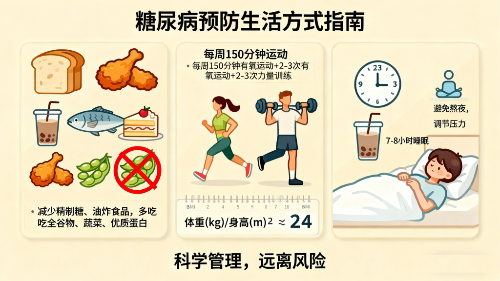 饮食上,减少精制糖、油炸食品、含糖饮料的摄入,多吃全谷物、蔬菜、优质蛋白(如鱼、虾、豆制品),控制总热量摄入,避免暴饮暴食;运动上,每周坚持至少150分钟中等强度有氧运动(如快走、慢跑、游泳),搭配2-3次力量训练,控制体重在合理范围(BMI<24);作息上,避免长期熬夜,保证7-8小时睡眠,学会调节压力,保持情绪稳定。