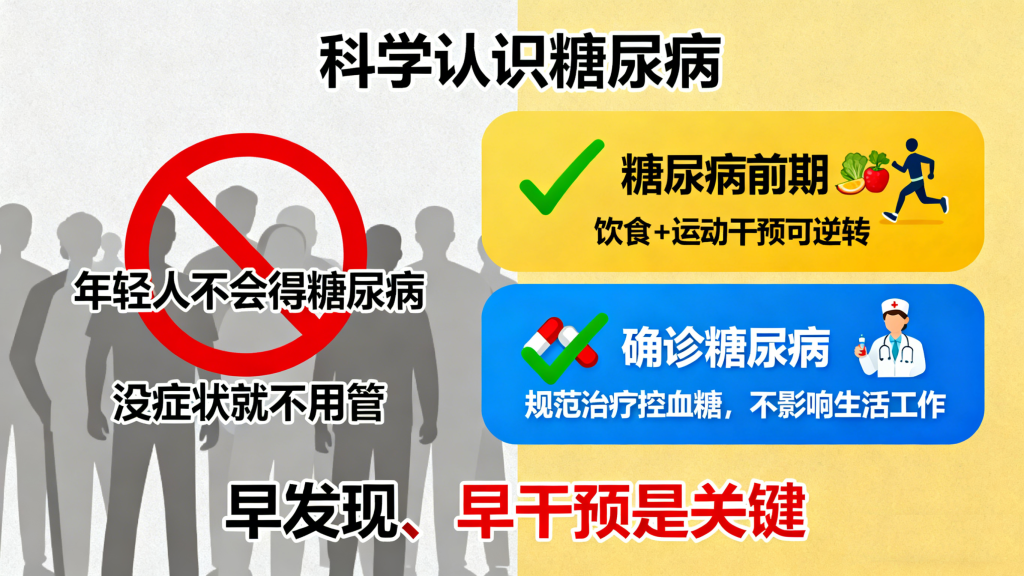 摒弃“年轻人不会得糖尿病”“没症状就不用管”的错误观念,一旦发现血糖异常,及时就医咨询。糖尿病前期通过饮食、运动等干预,完全有机会逆转;即便确诊糖尿病,早期规范治疗,也能有效控制血糖,减少并发症发生,不影响正常生活与工作。