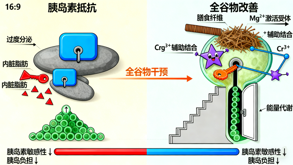 一方面,全谷物中的膳食纤维能降低肠道对脂肪的吸收,减少体内脂肪堆积,尤其是内脏脂肪。而内脏脂肪过多是导致胰岛素抵抗的重要原因,减少脂肪堆积能直接改善细胞对胰岛素的反应。另一方面,全谷物富含的B族维生素(如维生素B6、B12)、矿物质(如镁、铬)等营养成分,是胰岛素合成与发挥作用的重要辅助物质。